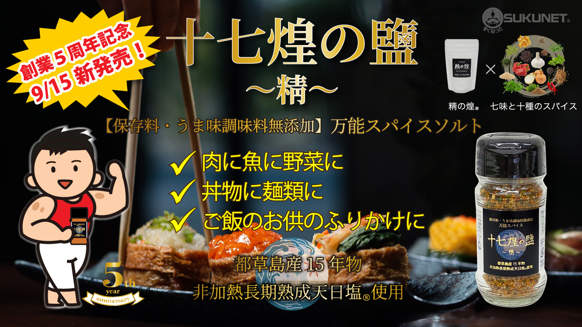 この度、創業5周年記念としまして非加熱長期熟成天日塩®15年物「精の煌®」を使用した万能スパイスソルト「十七煌の鹽~精~」 を発売いたします。